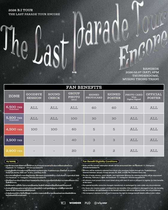 อย่าพลาดโอกาสสุดท้ายที่จะได้สัมผัสความทรงจำอันอบอุ่นและเต็มไปด้วยพลังจากศิลปินหนุ่มที่ครองใจแฟนเพลงทั่วโลก เพราะครั้งนี้ B.I จะพาทุกคนกระโดดไปพร้อมกันอีกครั้ง ในค่ำคืนแห่งเสียงดนตรี รอยยิ้ม และความรู้สึกที่ไม่มีวันลืม เตรียมนิ้วให้พร้อม เตรียมหัวใจให้แน่น แล้วมาสร้างประวัติศาสตร์หน้าใหม่ไปด้วยกันใน “2026 B.I TOUR: The Last Parade Tour ENCORE in BANGKOK” เพราะนี่อาจเป็นพาเหรดแห่งความทรงจำที่ไม่มีซ้ำสองอีกแล้ว!