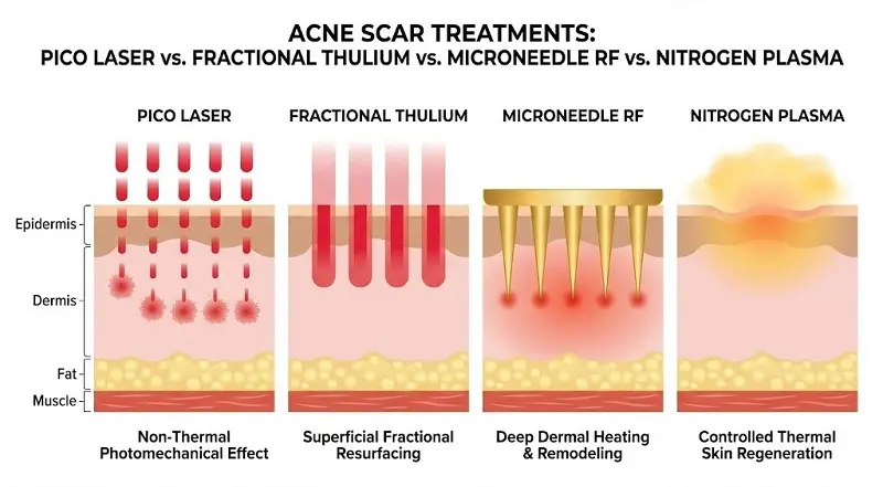 หลุมสิวไม่ใช่แค่ปัญหาผิวไม่เรียบ แต่คือความเสียหายของโครงสร้างคอลลาเจนในชั้นลึก ปัจจุบันการรักษาหลุมสิวไม่ได้จำกัดแค่เลเซอร์แรง ๆ เหมือนในอดีต แต่พัฒนาไปสู่แนวคิด ฟื้นฟูผิวจากหลายระดับชั้น พร้อมลดการบาดเจ็บและพักฟื้น โดยเทคโนโลยีที่นิยมในยุคปัจจุบัน ได้แก่ Pico Laser, Fractional Microneedle RF, Nitrogen Plasma, Fractional Thulium Laser และ Foam CO₂