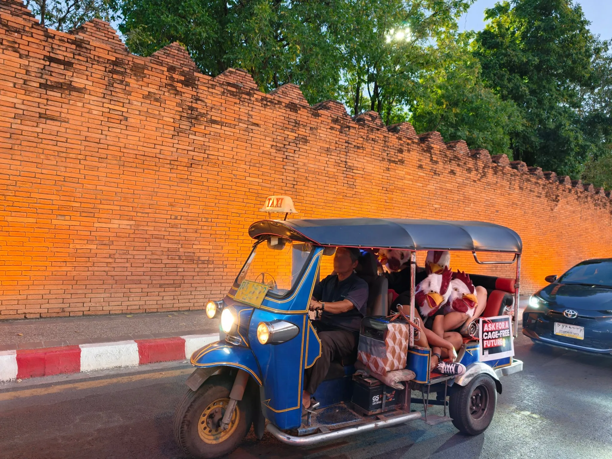 ตุ๊กตุ๊กสะท้อนภาพจริง: กลุ่มม๊อบหน้ากากไก่นั่งเบียดเสียดกันบนรถตุ๊กตุ๊กที่แล่นไปทั่วเมืองในช่วงเวลาเร่งด่วน เพื่อสะท้อนสภาพความแออัดและข้อจำกัดของแม่ไก่ในระบบกรงตับ (Battery Cages) ซึ่งจำกัดการแสดงพฤติกรรมตามธรรมชาติ เช่น การขยับปีกหรือการเกาะคอน