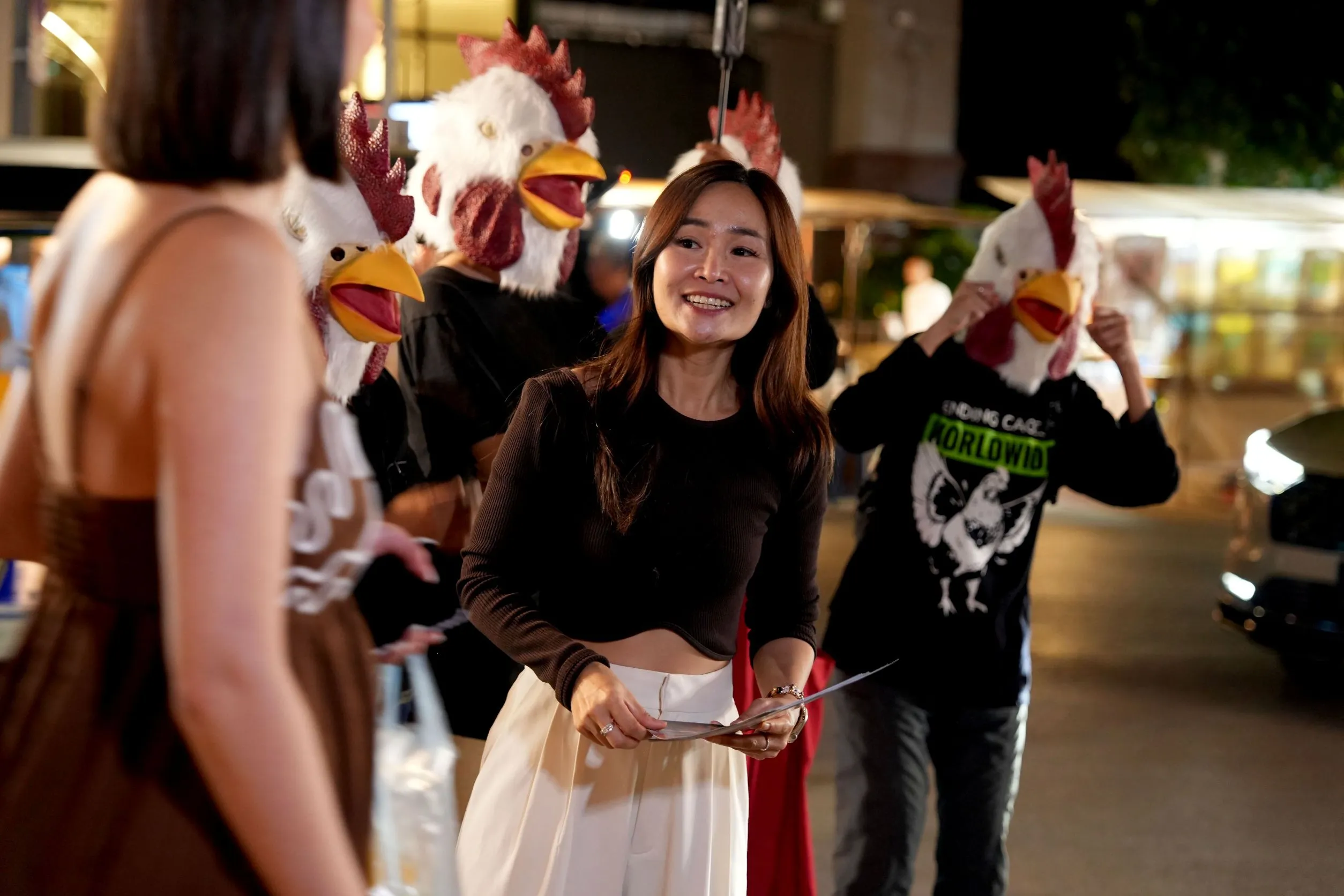 การมีส่วนร่วมของชุมชน: กลุ่มอาสาสมัครและม๊อบหน้ากากไก่ร่วมแจกใบปลิวข้อมูลหลายภาษาแก่ประชาชนและนักท่องเที่ยวในย่านตลาดไนท์บาซ่า เพื่อชวนให้สังคมตระหนักถึงความสำคัญของการเปลี่ยนผ่านไปสู่ระบบการผลิตที่มีมนุษยธรรมมากขึ้น ซึ่งได้รับความสนใจและเสียงตอบรับในเชิงบวกจากผู้สัญจรไปมา