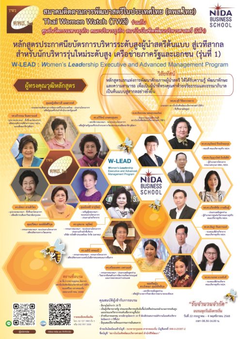 คุณหญิง ทิพาวดี เมฆสวรรค์ นายกสมาคมติดตามการพัฒนาสตรีในประเทศไทย (ตพส.ไทย) ร่วมมือกับ ศูนย์นวัตกรรมทางธุรกิจ คณะบริหารธุรกิจ สถาบันบัณฑิตพัฒนบริหารศาสตร์ (นิด้า) ขอเชิญชวนผู้บริหารรุ่นใหม่ ที่ประสบความสำเร็จในด้านวิชาชีพและด้านธุรกิจ ภาครัฐและเอกชน เข้ารับการอบรม หลักสูตรประกาศนียบัตรชั้นสูงผู้นำสตรีต้นแบบสู่สากล รุ่นที่ 1(W-LEAD) โดยมี ผู้ทรงคุณวุฒิต่าง ๆ มากมาย อาทิ ดร. ฉวีรัตน์ เกษตรสุนทร , รศ. นรีวรรณ จินตกานนท์ , ดร. มัทนา สานติวัตร ,ดร. สร้อยเพชร เรศานนท์, พลตรีหญิง ดร. อังคณา สุเมธสิทธิกุล ,ศ.ดร. ทิพวรรณ หล่อสุวรรณรัตน์ , รศ .ดร .จุรี วิจิตรวาทการ , รศ.ดร. อนุกัลยณ์ จีระลักษณกุล , รศ.ดร. กัญญาภัสส์ ปันจัยสีห์ , รศ.ดร.เกียรติชัย กาฬสินธ์ , รศ.ดร. อัษฎา จินตกานนท์ , รศ.ดร. กนกพร นาคทับที , คุณนันทลี จารุรัตน์ , ดร.เมธินี เทพมณี , ดร. นุชนารถ วสุรัตน์ , คุณ ปริศนา พงษ์ทัดศิริกุล ฯลฯ เป็นผู้ให้การอบรมหลักสูตรนี้ ฯลฯ