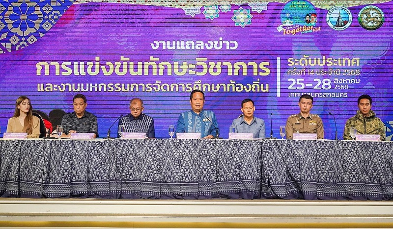 เมื่อวันที่ 7 สิงหาคม 2568 ณ ห้องศรีสกล โรงแรม เอ็ม.เจ.เดอะมาเจสติคสกลนคร จังหวัดสกลนคร นายวีรรัตน์ ธีรมิตร รองผู้ว่าราชการจังหวัดสกลนคร เป็นประธานในงานแถลงข่าว “การแข่งขันทักษะวิชาการและงานมหกรรมการจัดการศึกษาท้องถิ่น ระดับประเทศ ครั้งที่ 14 ประจำปี 2568” โดยมี นายโกมุท ทีฆธนานนท์ นายกเทศมนตรีนครสกลนคร นายธนาคม ไหลเจริญกิจ ผู้อำนวยการกลุ่มส่งเสริมและพัฒนาการศึกษา สำนักงานส่งเสริมการปกครองท้องถิ่นจังหวัดสกลนคร ผศ.ชาคริต ชาญชิตปรีชา อธิการบดีมหาวิทยาลัยราชภัฏสกลนคร และพ.ต.อ.อภิรักษ์ ศรีหารักษา ผู้กำกับการสถานีตำรวจภูธร เมืองสกลนคร ร่วมแถลงรายละเอียดการจัดงาน รวมถึง “พาขวัญ” พาขวัญ น้อยใจบุญ ศิลปินนักแสดงลูกหลานชาวสกลนคร และ “ลีซอ” ธีรเทพ วิโนทัย อดีตนักฟุตบอลทีมชาติไทย มาร่วมสร้างแรงบันดาลใจให้กับน้อง ๆ ที่เข้าร่วมการแข่งขันครั้งนี้