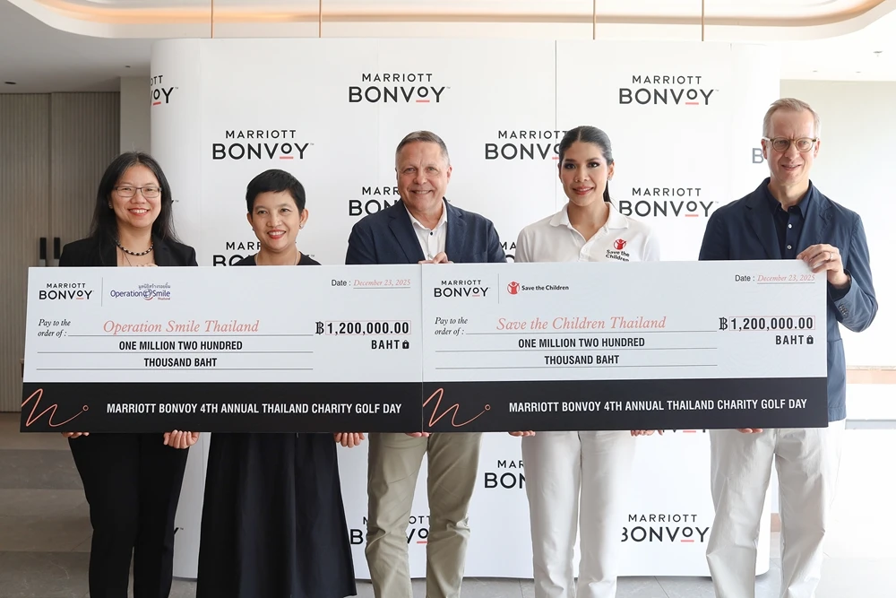 กรุงเทพฯ ประเทศไทย: 5 มกราคม 2568 – แมริออท บอนวอย (Marriott Bonvoy) โปรแกรมการท่องเที่ยวระดับโลกและพอร์ตโฟลิโอแบรนด์โรงแรมชั้นนำกว่า 30 แบรนด์ ภายใต้ แมริออท อินเตอร์เนชั่นแนล (Marriott International) ได้มอบเงินบริจาคจำนวน 2.4 ล้านบาท ให้แก่สององค์กรการกุศลชั้นนำ ได้แก่ Save the Children Thailand (มูลนิธิช่วยเหลือเด็ก (ประเทศไทย) และ Operation Smile Thailand (มูลนิธิสร้างร้อยยิ้ม ประเทศไทย) ภายหลังความสำเร็จของการจัดงานกอล์ฟการกุศลแมริออท บอนวอย 2568 (Marriott Bonvoy Thailand Charity Golf Day 2025)