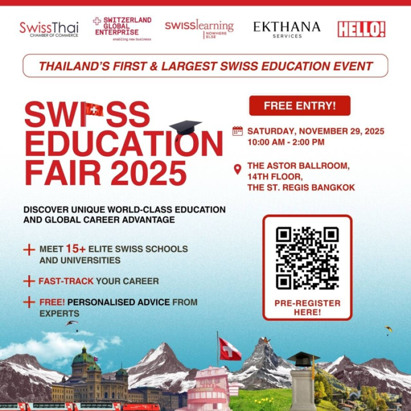 นำโดย Swiss-Thai Chamber of Commerce ร่วมกับ Switzerland Global Enterprise, Swiss Learning, Ekthana Services และนิตยสาร HELLO! ประเทศไทย เตรียมจัดงานแนะแนวการศึกษาครั้งยิ่งใหญ่ “SWISS EDUCATION FAIR 2025” รวบรวมโรงเรียนและมหาวิทยาลัยชั้นนำระดับแนวหน้าของประเทศสวิตเซอร์แลนด์มากกว่า 15 สถาบันมาไว้ในที่เดียว พร้อมกิจกรรมหลากหลาย เปิดโอกาสให้ทุกครอบครัวได้มาทำความ วันเสาร์ที่ 29 พฤศจิกายน 2568 เวลา 10.00 – 14.00น. ณ The Astor Ballroom ชั้น 14 โรงแรม เดอะ เซนต์ รีจิส กรุงเทพ