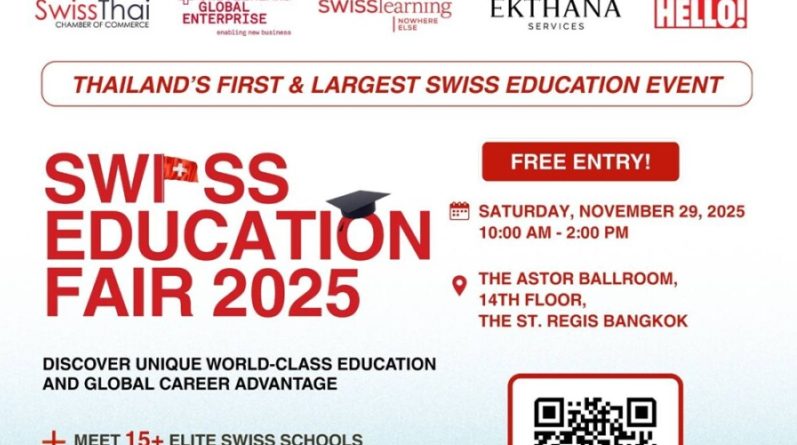 “Swiss Education Fair 2025” งานแนะแนวการศึกษาสวิตเซอร์แลนด์ครั้งยิ่งใหญ่ที่สุดในประเทศไทย ในวันเสาร์ที่ 29 พฤศจิกายน 2568 เวลา 10.00 – 14.00 น. ณ The Astor Ballroom ชั้น 14 โรงแรม เดอะ เซนต์ รีจิส กรุงเทพ