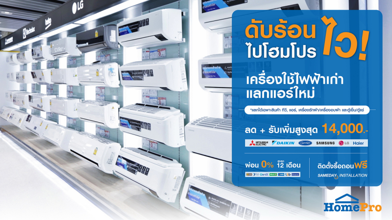 หน้าร้อนแบบนี้ บ้านไหนยังไม่มีแอร์บ้าง ? ‘โฮมโปร’ ชวนคุณลดอุณหภูมิบ้าน เปลี่ยนห้องน่าอยู่ด้วยข้อเสนอสุดคุ้ม เย็นเร็ว…เย็นไว ตลอดเดือนพฤษภาคมนี้ ในแคมเปญ ‘ดับร้อนไว! ไปโฮมโปร’ คัดสรรแอร์เครื่องใหม่แกะกล่องแบรนด์ดัง ที่ผสานเทคโนโลยีอินเวอร์เตอร์มาช่วยเรื่องประหยัดพลังงาน ทั้ง MITSUBISHI, DAIKIN, CARRIER, SAMSUNG, LG, HAIER ให้เลือกกันแบบจัดเต็ม เป็นเจ้าของได้…ในราคาพิเศษกว่าใคร! ด้วยดีลดี ๆ ช่วยรักษ์โลก ‘แลกเก่าเพื่อโลกใหม่ (Trade-In)’ เพียงนำเครื่องใช้ไฟฟ้าเก่า (เฉพาะทีวี, แอร์, เครื่องซักผ้า/เครื่องอบผ้า และตู้เย็น/ตู้แช่) มาแลกซื้อแอร์ใหม่ ได้ทันที ส่วนลด+รับเพิ่มสูงสุดกว่า 14,000 บาท และสิทธิ์ผ่อนชำระสบาย ๆ 0% นานสูงสุดถึง 12 เดือน (กับบัตรเครดิตและบัตรสินเชื่อที่ร่วมรายการ)